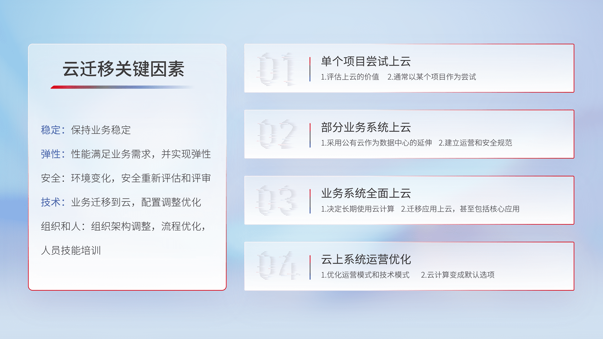 结合实际业务,,,从规划设计、、、、云平台选型、、云原生改造、、数据迁移、、集成交付,,,迁移全过程为客户识别最佳上云路径,,,做好风险识别管理,,,,设计网络架构、、身份权限、、、、安全审计合规、、、操作审计、、、、日志审计、、监控告警策略、、、、多站点容灾设计等,,,对云上基础设施进行整体规划,,,提升IT治理水平,,,,以满足弹性、、高可用、、、高性能的需求。。。。