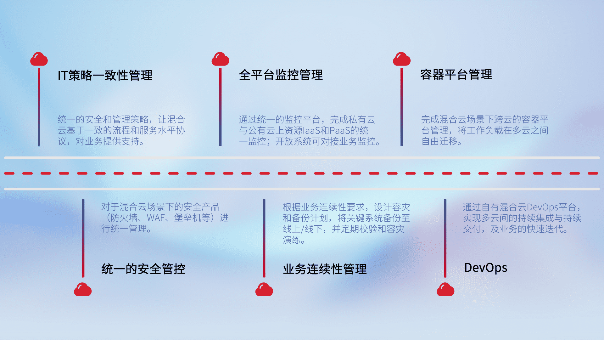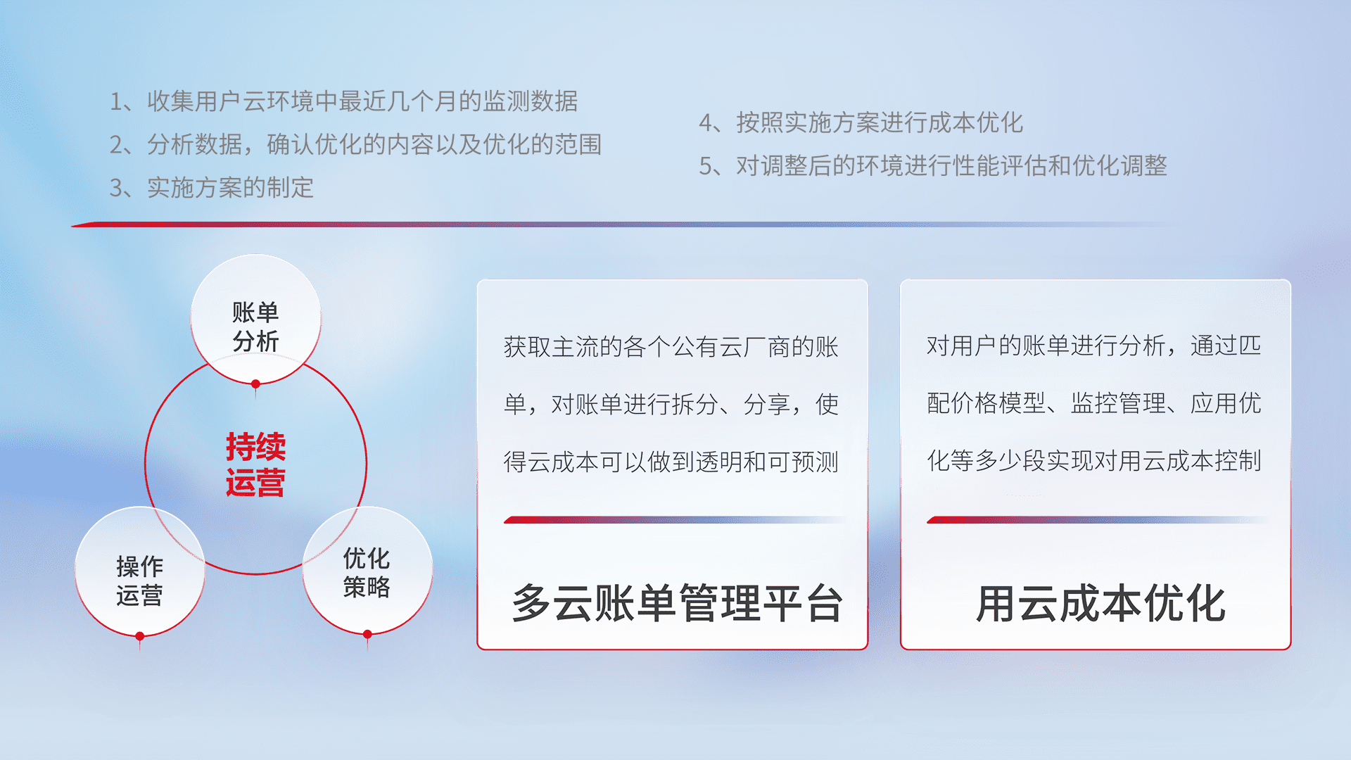 通过多云纳管,,,,以统一的资源数据模型把客户的云资源进行抽象和封装,,,,进而实现对多云资源的统一操作,,,,保障云资源管理的可靠性、、、、稳定性与可用性。。量身定制化运维内容,,配置、、开发运维、、、、补丁管理、、、备份、、监控、、认证和访问管理、、、、审计和日常巡检等,,,,保障在用云过程中的可靠度,,,,稳定度以及高可用率。。